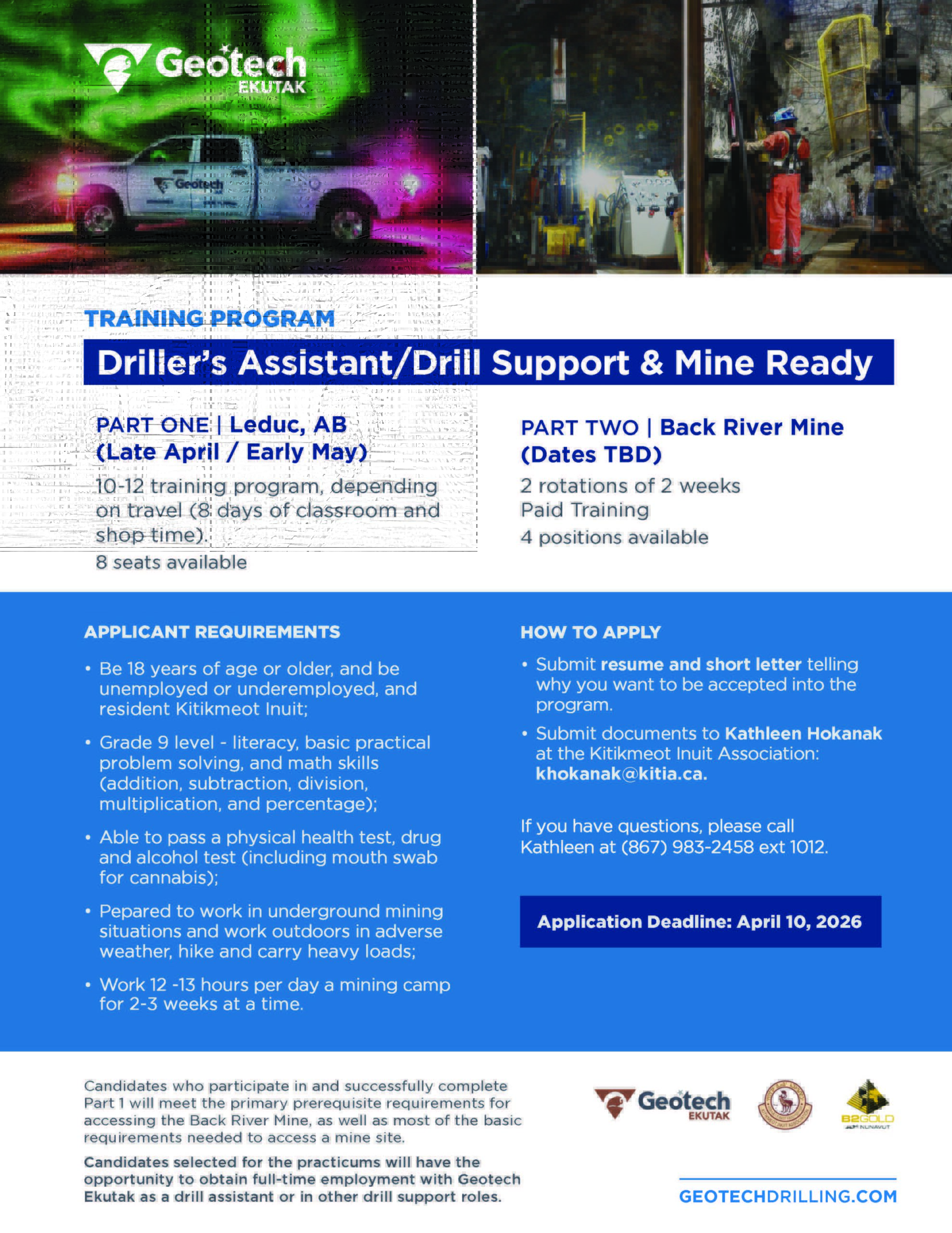 Training Opportunity: Part One to be held in Leduc, Alberta in late April/early May. Deadline to apply for consideration is April 10. 2026. Please submit resume and short letter telling why you want to be accepted into the program to Kathleen Hokanak at khokanak@kitia.ca. If you have any questions, please email Kathleen or call her at 867.983.2458 Ext. 1012. For applicant requirements, please see attached poster before contacting Kathleen.