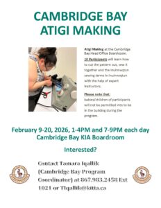 Atigi Making at the Cambridge Bay Head Office Boardroom. 10 Participants will learn how to cut the pattern out, sew it together and the Inuinnaqtun sewing terms in Inuinnaqtun with the help of expert instructors.