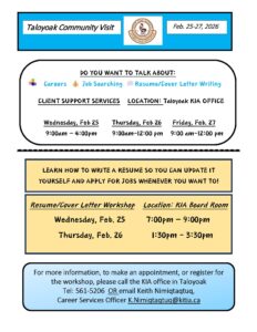 The KIA will be in Taloyoak February 25-27 (Wednesday to Friday) to help community members with career support, job searching and resume/cover letters. Resume writing workshops will be offered Wednesday evening and Thursday afternoon. For more information, or to make an appointment, please call the Taloyoak KIA office at 561-5206 or email Keith at K.Nimiqtaqtuq@kitia.ca.