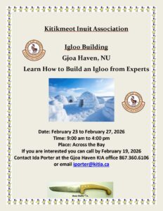 The KIA will be hosting an Igloo Building Program in Gjoa Haven from February 23-27 (9 am to 4 pm each day). This is the chance to learn this traditional skill from expert instructors. If you are interested, contact Ida Porter at the Gjoa Haven KIA Office by calling 867.360.6106 or emailing her at iporter@kitia.ca by February 19, 2026.