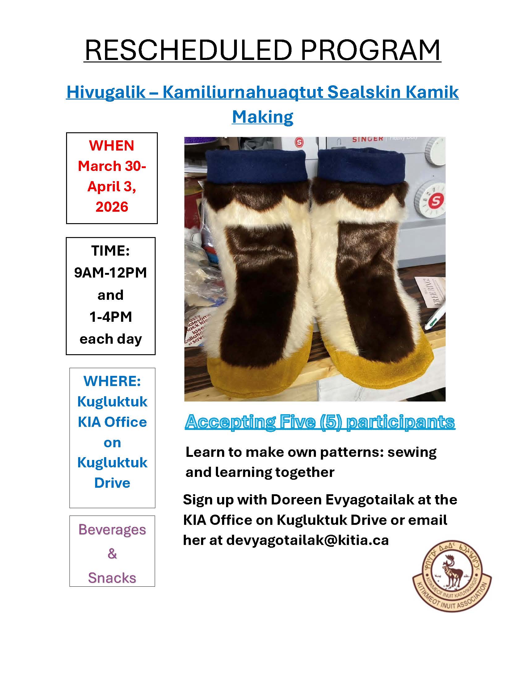 Only 5 spaces available. If you are interested, sign up with Doreen Evyagotailak at the KIA Office on Kugluktuk Drive or email her at devyagotailak@kitia.ca