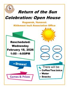 Come join the KIA at our Kugaaruk Office on Wednesday, February 18 from 1-4 pm to celebrate the return of the sun. Snacks, drinks, draws, games and prizes await you. Not to mention our friendly staff and a chance to get together with you fellow Kugaaruk community members and celebrate the return of the sun. This event was originally scheduled for January 30, 2026 but had to be postponed due to a building water issue at that time.