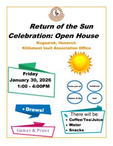 Come join the KIA at our Kugaaruk Office on Friday, January 30 from 1-4 pm to celebrate the return of the sun. Snacks, drinks, draws, games and prizes await you. Not to mention our friendly staff and a chance to get together with you fellow Kugaaruk community members and celebrate the return of the sun.